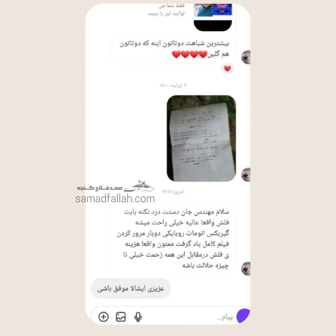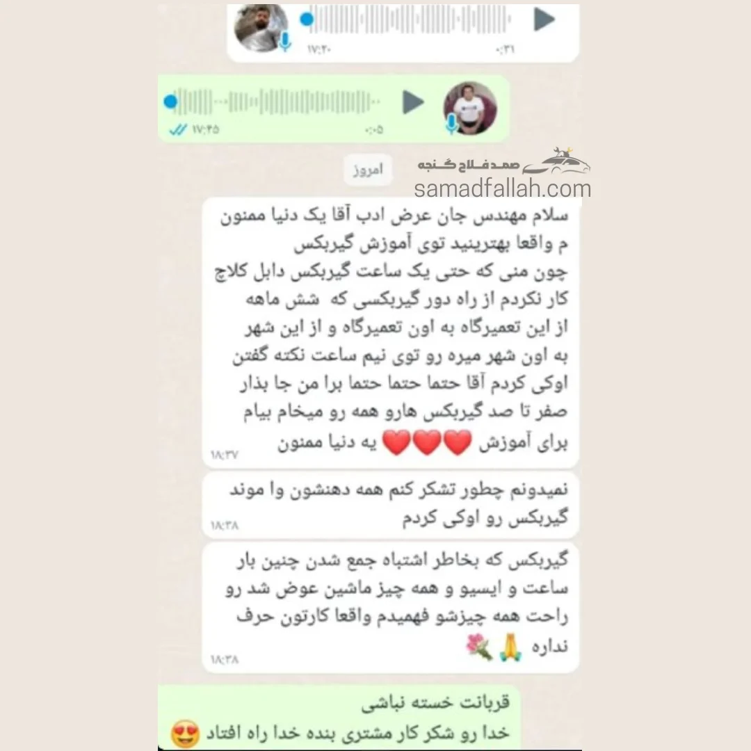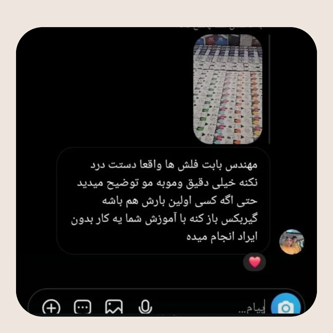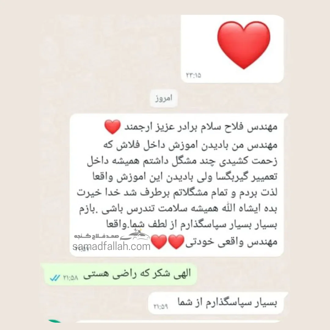 مهندس فلاح سلام ❤️ برادر عزیز ارجمند مهندس من بادیدن آموزش داخل فلاش که زحمت کشیدی چند مشگل داشتم همیشه داخل تعمییر گیربگسا ولی با دیدن این اموزش واقعا لذت بردم و تمام مشگلاتم برطرف شد خدا خیرت بده ایشاه الله همیشه سلامت تندرس باشی بازم بسیار بسیار سپاسگذارم از لطف شما واقعا
